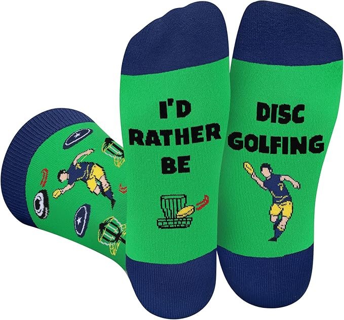 These “I’d Rather Be…” novelty golf socks are just the kind of funny-but-useful gift people love opening at Christmas or birthdays. Every disc golfer needs socks… especially socks that show what they’d rather be doing.
